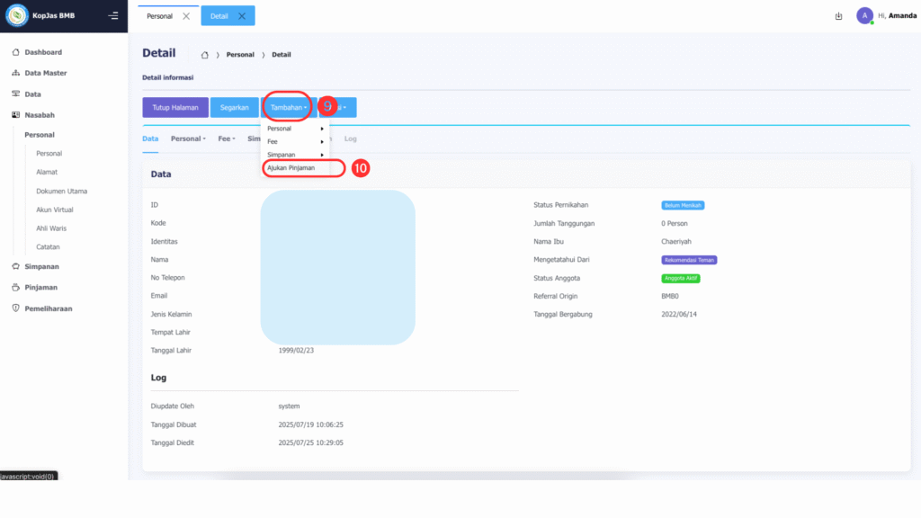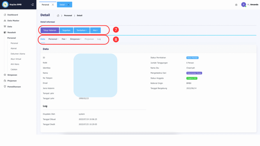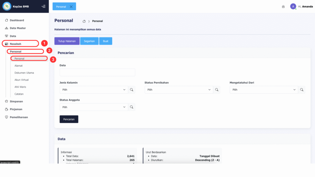 1. Pada menu di kanan pertama klik menu “Nasabah”