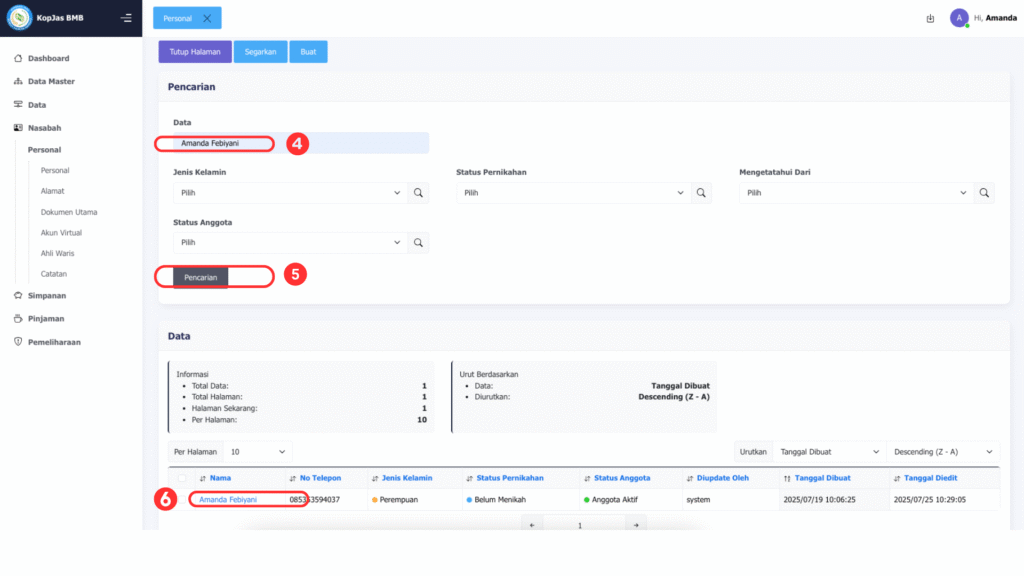 4. Isi pada kolom pencarian nama nasabah yang akan menjadi calon peminjam